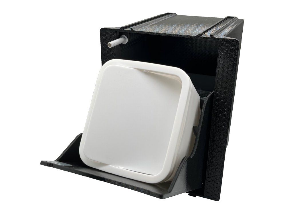 - Vonkajšia krabica sa pevne ukotvuje do steny, vnútorná sa vyklopí a umožní rýchlu výmenu koša.