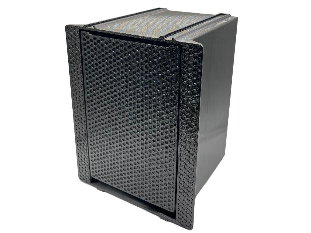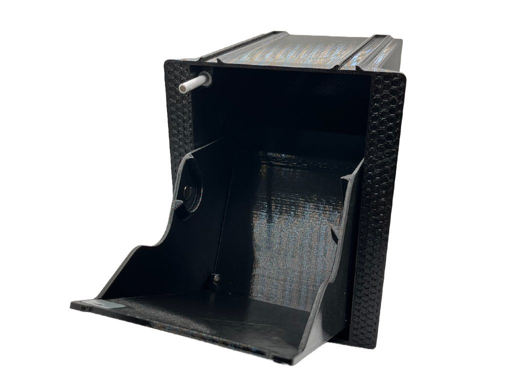 Výrobok sa skladá z dvoch plastových krabíc vyrobených z PETG – materiálu s výbornou odolnosťou voči vlhkosti, teplotným výkyvom a bežným čistiacim prostriedkom. Vonkajšia krabica sa ukotvuje do steny a tvorí pevný základ celej inštalácie. Vnútorná krabica je uchytená na pántoch a na jej prednej ploche je prilepený fragment krycieho materiálu – po zavretí dokonale splýva s okolitou plochou.